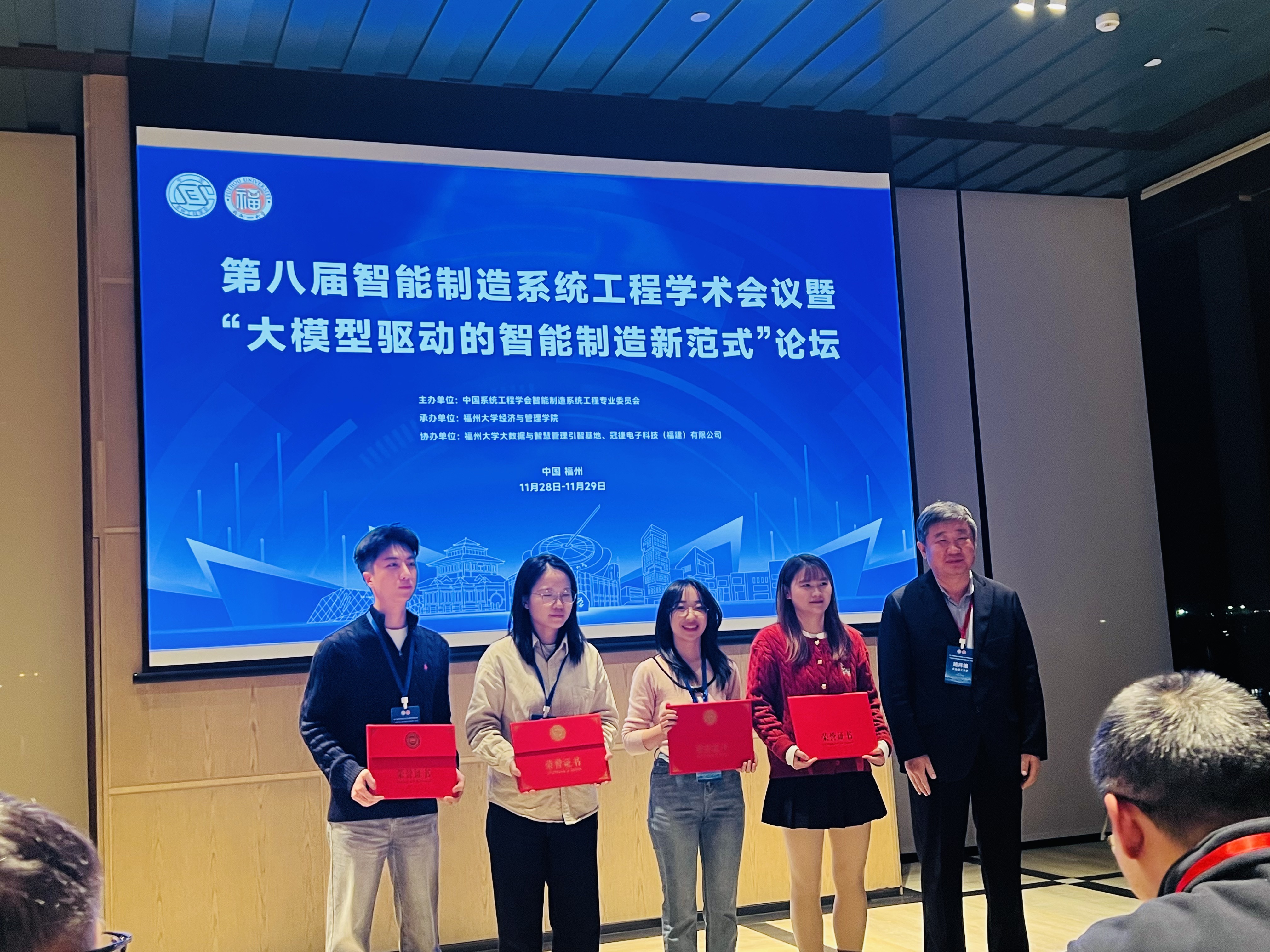 本次会议以“大模型驱动的智能制造新范式”为主题,探讨中国制造企业生产、运营、服务环节中的新技术、新挑战、新问题和新模型,展示AI大模型时代下智能制造系统工程理论与应用领域的新成果和新进展。会议开设了“学科建设发展论坛”“智能制造技术前沿”“运筹与管理科学”“智能决策与优化”“智慧运营管理”等二十二个分会场,汇聚了杨善林院士、张俊标会士等24位国家级领军人才、52位国家级青年人才,以及来自高校、科研院所和企业的400余位专家学者,开展132场特邀报告。经过严格筛选,会议对60余篇论文来稿进行了汇报交流,并遴选出30余篇高质量论文,其中,优秀论文一等奖4名。抢庄牛牛 管理科学与工程学科博士生郭佳润(指导教师:蒋忠中教授)作为第一作者的论文《Investment versus Loan: Strategic Choices for Manufacturer and Supplier under Technology Blockades》受邀在会上进行了专题汇报,并荣获第八届智能制造系统工程学术会议优秀论文一等奖。